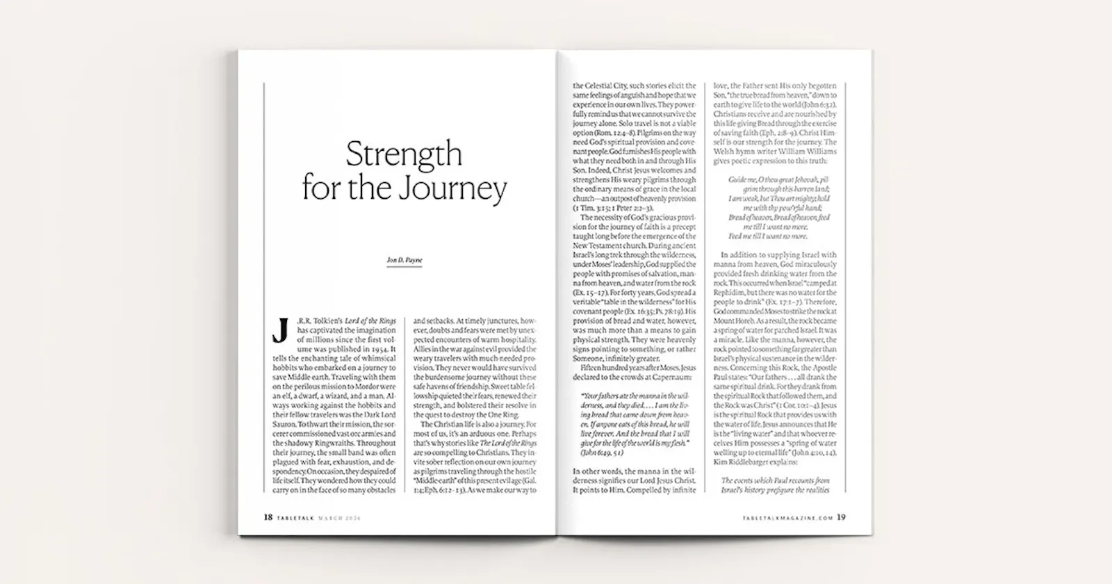 The Christian life is also a journey. For most of us, it’s an arduous one. Perhaps that’s why stories like The Lord of the Rings are so compelling to Christians. They invite sober reflection on our own journey as pilgrims traveling through the hostile “Middle-earth” of this present evil age (Gal. 1:4; Eph. 6:12–13). As we make our way to the Celestial City, such stories elicit the same feelings of anguish and hope that we experience in our own lives. They powerfully remind us that we cannot survive the journey alone. Solo travel is not a viable option (Rom. 12:4–8). Pilgrims on the way need God’s spiritual provision and covenant people. God furnishes His people with what they need both in and through His Son. Indeed, Christ Jesus welcomes and strengthens His weary pilgrims through the ordinary means of grace in the local church—an outpost of heavenly provision (1 Tim. 3:15; 1 Peter 2:2–3).